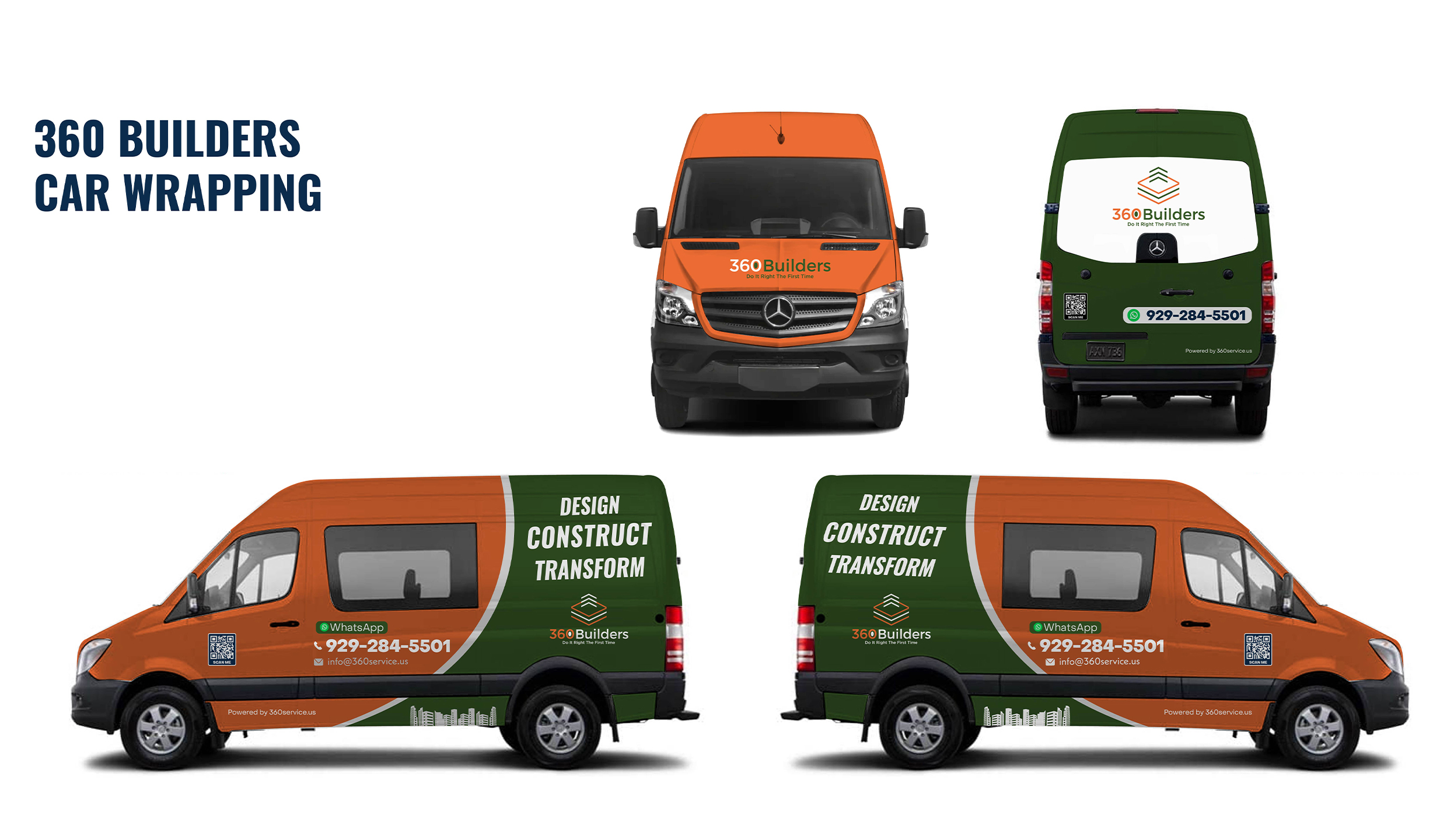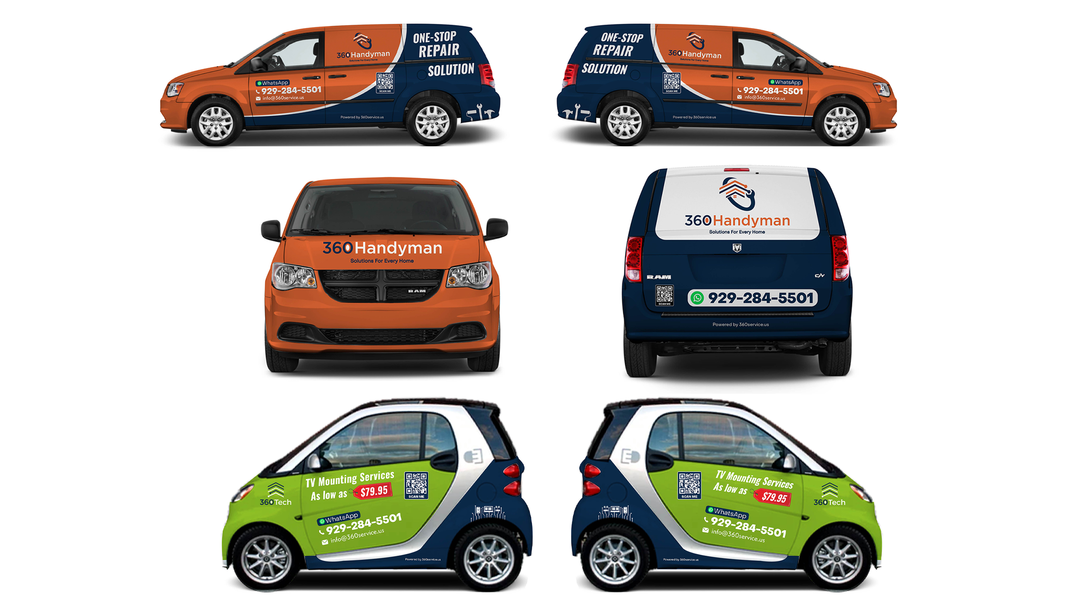 360 Services — covering Builders, Tech, and Handyman divisions — approached us to design car wrapping for their fleet. The goal was to create standout visuals that give each division its own identity while still presenting a consistent brand image. The challenge was designing a system adaptable to multiple car models, all while communicating professionalism, recognition, and a modern aesthetic.