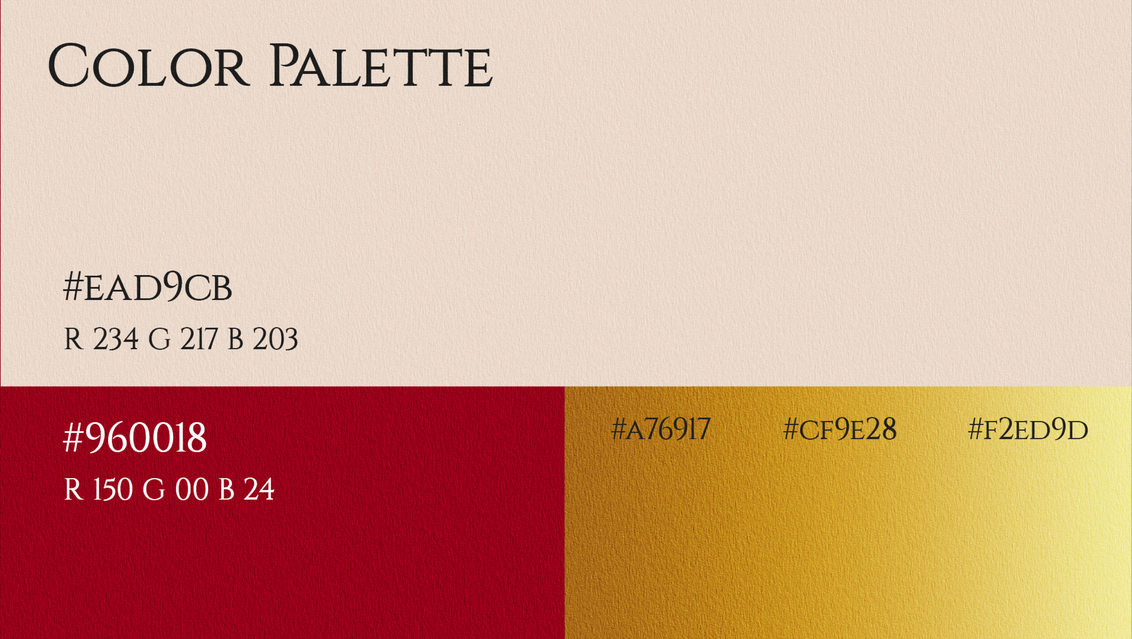 - Brand Identity System: Bold red-and-gold palette paired with refined typography for a luxury aesthetic.