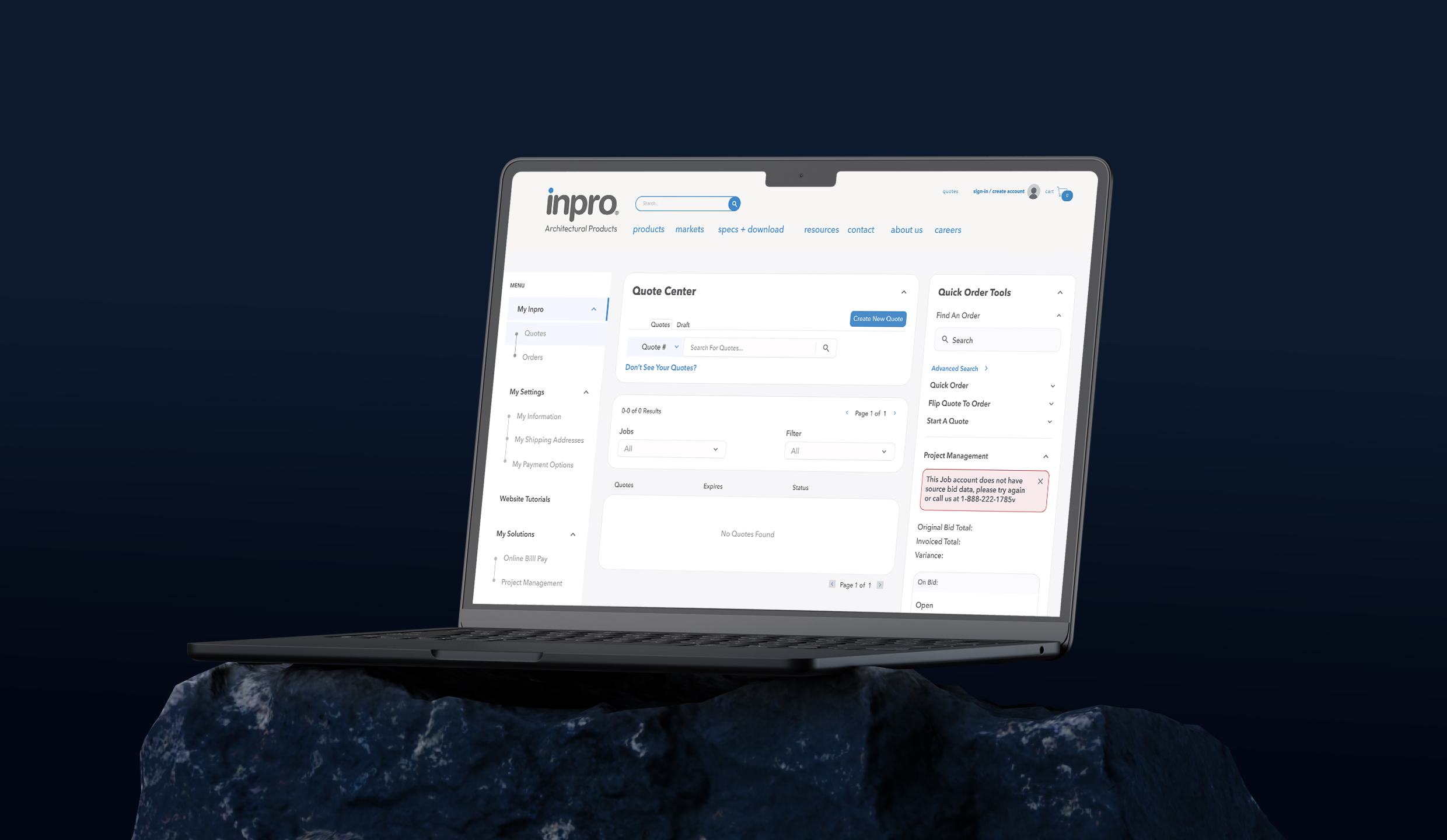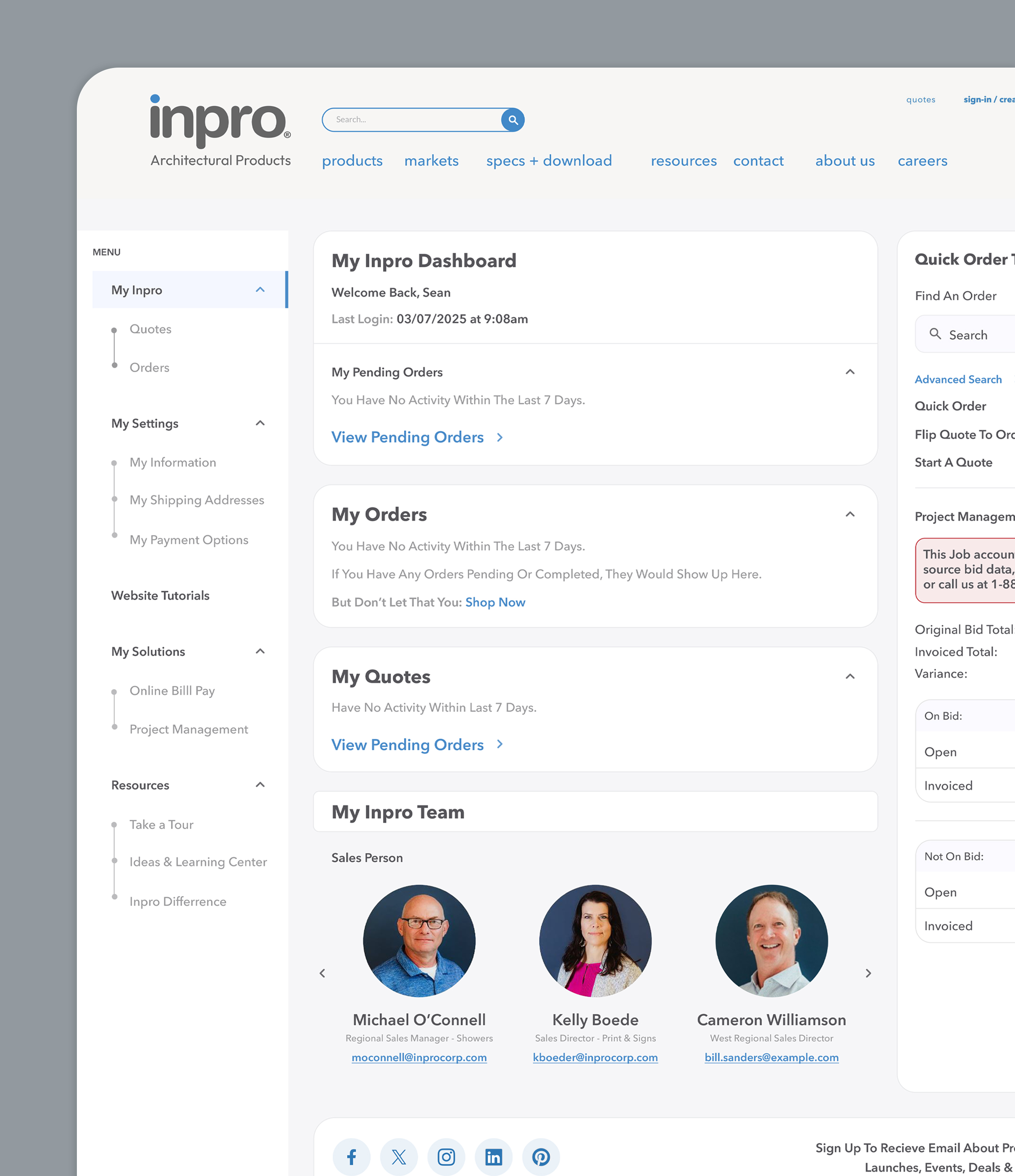 A clean, user-friendly dashboard for Inpro that simplifies navigation, streamlines quoting, and enhances customer experience.
